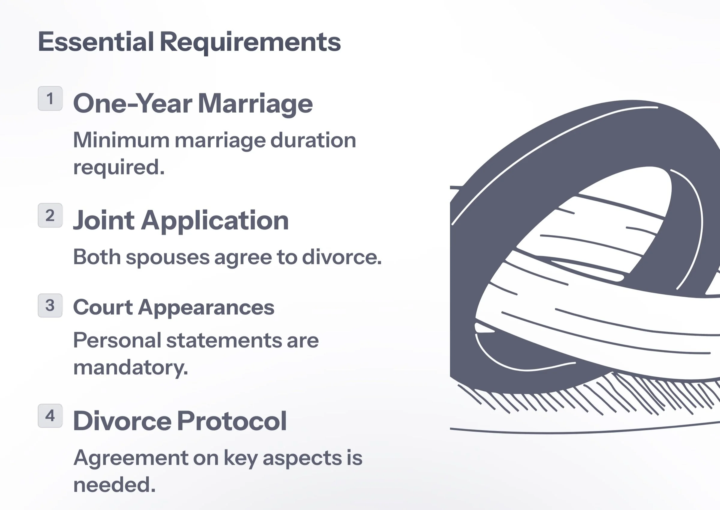 One of the most crucial requirements is that both spouses must appear personally before the judge - this cannot be delegated to lawyers or done through written statements alone. The judge must directly hear from both parties to verify that their decision to divorce is voluntary and free from coercion. Even if a spouse is in prison, they must be brought to court or participate via video conference with consent. This personal appearance requirement exists to protect both parties and ensure that neither spouse is being pressured into the divorce against their will.